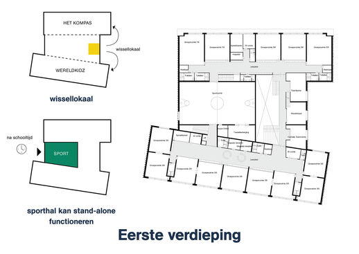 Het schoolgebouw van De Werledkidz (Het Palet) was aan vervangende nieuwbouw toe. Met de gehele ontwikkeling van het Harmonieplein is er gekozen om ook het Kompas en kinderopvang Kind & Co ook in de nieuwbouw te betrekken. Dat is voor de gemeente een prachtige combinatie en komt de beheersbaarheid van de verschillende gebruikers ten goede. Het is een enorme meerwaarde om gezamenlijk functies te kunnen gebruiken onder 1 dak. Met het maken van een wissellokaal kan er heel flexibel worden ingegaan op het groeien of krimpen van een van de beide scholen. Gezamelijk kunnen de scholen en de kinderopvang gebruik maken van de aula, het speellokaal en de keuken en de gymzaal. Tot op heden moeten de kinderen van beide scholen een stuk door Maarssen fietsen om naar hun gymzaal te kunnen komen. Met het onderbrengen van een gymzaal kunnen kinderen straks zonder tijdverlies en zeer veilig in de gymzaal aankomen. De realisatie van het samenbrengen van verschillende gebruikers is aan de ene kant een enorme meerwaarde maar aan de andere kant ook een uitdaging. Een uitdaging omdat de verschillende gebruikers hun eigen identiteit willen kunnen blijven behouden.